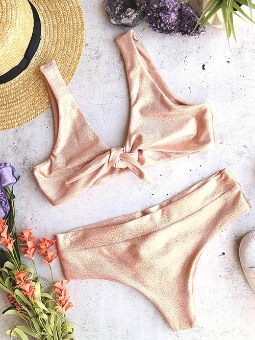 Front tied swimsuits are always the favorite as they are in 2018. Vintage style high-waisted bottom and front tie top combination seem to be the most preferred swimsuit at the sea-side.